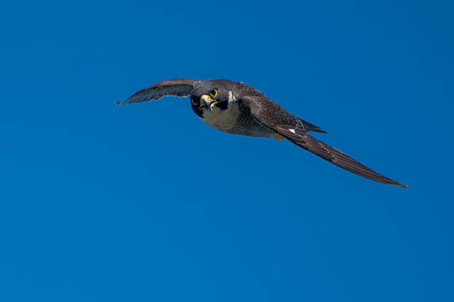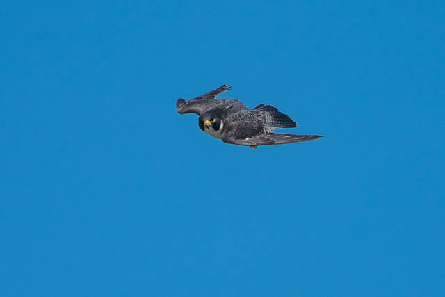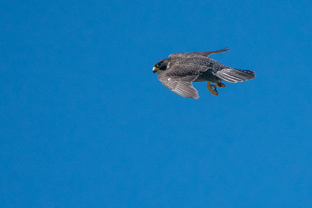 I waited for a fair while, and y patience was rewarded. One of the falcons flew past again.