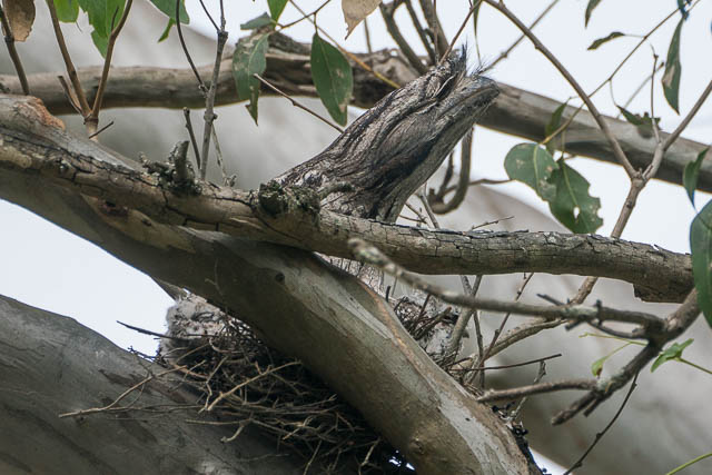 Back at the pools, I heard the Sacred Kingfisher again, but whenever I got close to it, it flew away before i could spot it, and I could hear the all again from another location. Walking around I did spot a Tawny Frogmouth in a nest. I could see it had at least one chick with it. The nest was not too high up, but it was difficult to get a clear view because of branches in the way. I returned to look at it a few times on my visit – and it looks like the parent has two chicks in the nest.
