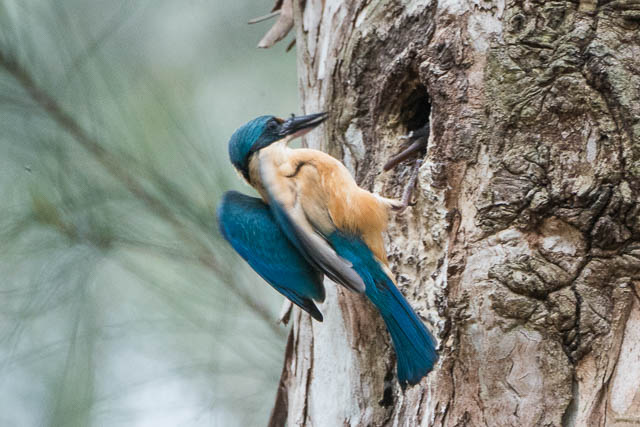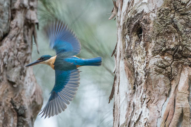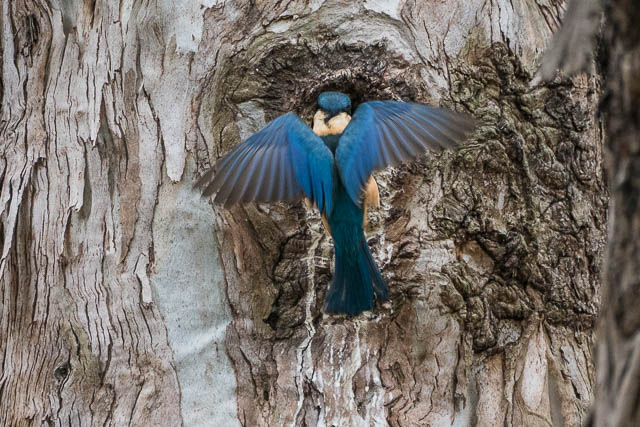 Not long after this it appeared again with another insect in its beak. It looked like it was bringing food to its young. These kingfishers normally drill holes with their beaks into termite nests high in trees . Nurragingy does not have such termite nests in trees, so I looked for a hollow.