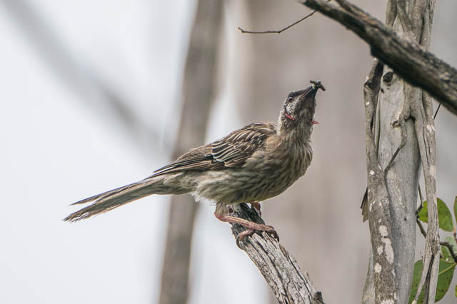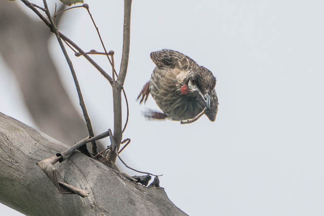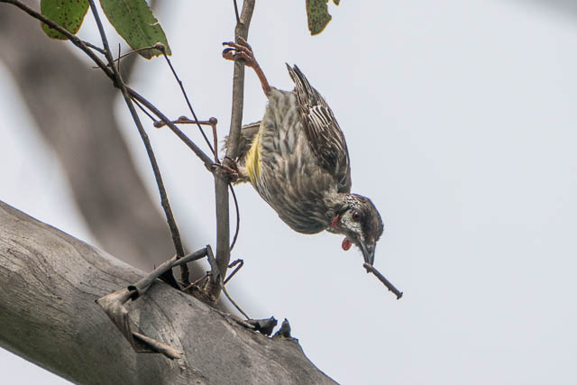 I then did the long loop walk through the bush areas. I did see a few honeyeaters – but got no good photos of them. The most interesting set of photos was of a Red Wattlebird. I saw it trying to get something out of a branch. It was an Inchworm. The bird succeeded in pulling it out then flew off with it.