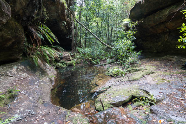 We walked downstream a few hundred metres to our side creek. Looking upstream, it did look promising. There were cliffs nearby. We walked up the branch for about twenty minutes – and had to scramble up a few bouldery sections. But waterfalls? – no major ones.  So we retraced our steps back to the main creek, and then set off downstream to Glenbrook Creek. The going was quite rough walking – boulders, pools, water gums. No fats walking, but not too bad and not too far. Near Glenbrook Creek – the rain started and was very heavy for about ten minutes.