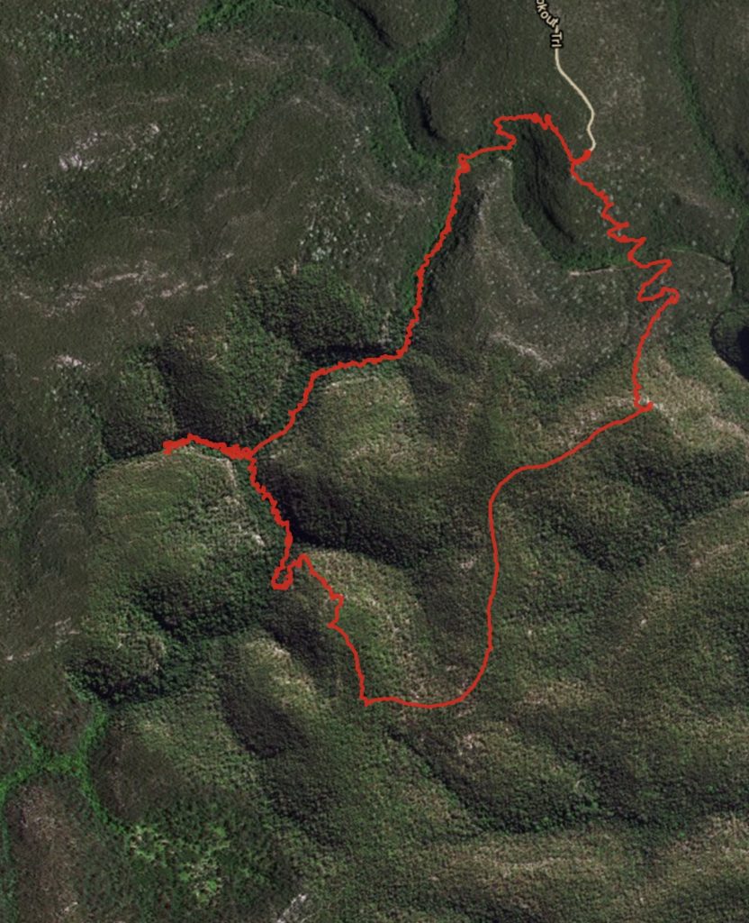 It looked like if you climbed up the Kings Link Track to Bunyan Lookout, and if you followed the track towards St Helena, you could then follow a ridge down into the creek and but downstream of the crater. Looking at maps and air photos, it seemed like the best place to look for a waterfall would be in a side creek not far downstream from where we would enter the creek.
