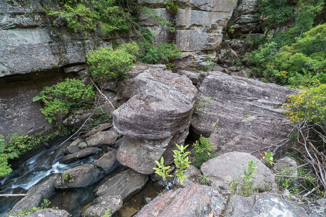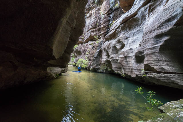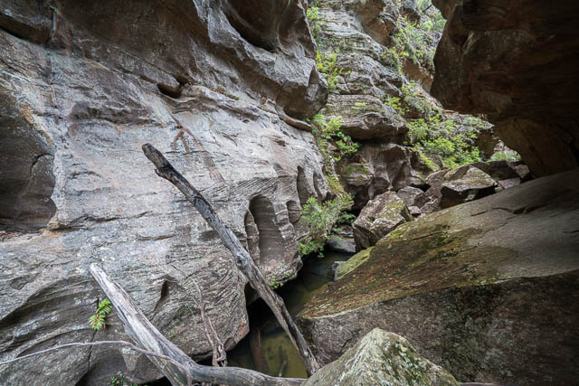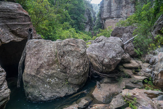 The section of Wollangambe Canyon that we visited is a series of long pools. Above are towering walls of sculptured sandstone. The pools are punctuated by jumbles of boulders and twisted Water Gums. The canyon experiences a lotto visitors – particularly during school holidays in summer. But on our trip we saw no other parties.