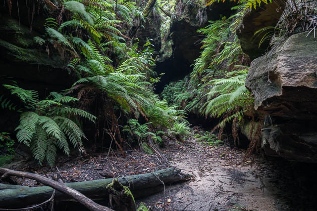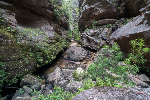 Along the canyon, several side canyons join the Wollangambe. We went up one of these, one known as Water Dragon Canyon. This short side excursion is well worthwhile as the canyon is very dark and narrow.