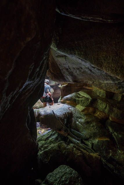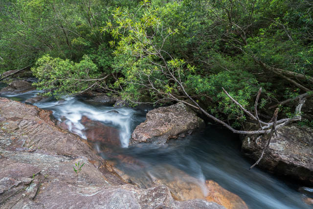And indeed the canyon section ended all too soon. Below the canyon was a rainforest gully. But first another drop had to be negotiated. This looked tricky – but turned out to be a very easy scramble. Then some slow walking – through boulders and fallen logs. Hard going. Slowly the creek walking improved to fairly open rainforest banks.