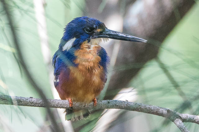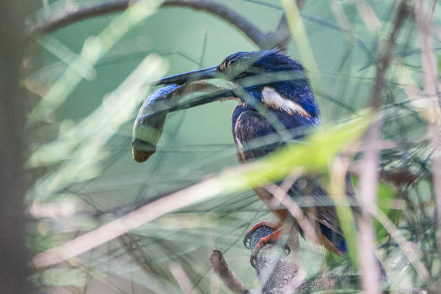 But I did see one of the Azure Kingfishers. It was hunting for food and flying between three of the pools. It would stay at one pool for a while, dive in a few times, sometimes getting a small fish, then fly off to one of the other pools. I had to walk around a bit, but it did provide some photographic opportunities.