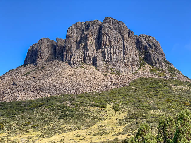 Back down at the campsite, we had breakfast. Our plan was to walk to Dixons Kingdom and then to Lake Ball and around it, and then down to Lake Adelaide. The day looks like being fine so we wanted to make the most of it before forecast bad weather arrived that evening. But before packing up, we made a quick trip to King Davids Peak. Signs in the valley indicate the “Central Gully” is closed to walkers, but it is a bit hard to tell which of the gullies is the central one. We ascended by a large scree gully close to the peak. This is steep but easy going.