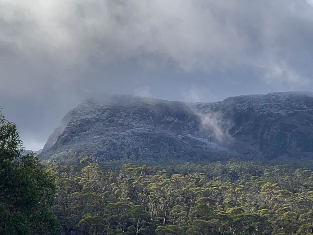 But we new, that even if the weather was bad, we had made good progress and only had a short walk back to the carpark. The weather did turn bad, but the bad weather was mostly while we asleep. We woke up to snow on the peaks nearby. We waited for the rain to stop before packing up, and then quickly walked back to rejoin the main track near Trappers Hut, and then were soon back down to the carpark. It had been a great walk.