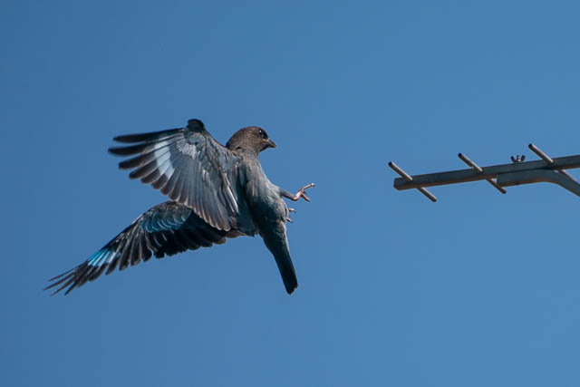 Slowly cycling back towards home, I spotted a very distant bird sitting on a pole in the golf firing range. With binoculars I could see it was a Dollar Bird. These are rare visitors to this area I think. It was soon joined by another.