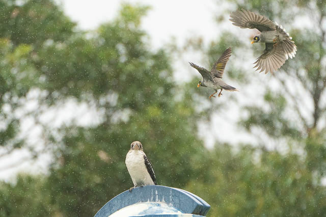 The raptor moved off, and things returned to normal. Later I noticed the Kookaburra on another lamppost. It was again being harassed by Noisy Miners.