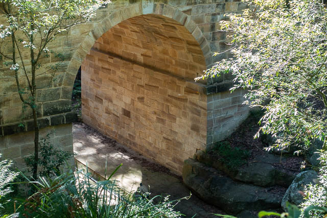 This impressive sandstone bridge was completed in 1865, and used for a single track of railway. It was later widened to fit two tracks. Many years later (1920’s) when the railway was diverted to Glenbrook Gorge, the bridge was repurposed as a road bridge for the Great Western Highway. Now the highway uses a bridge lower down Knapsack Gully.