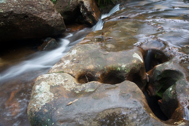 The streambed is a series of open rock slabs. There are interesting cascades and small holes and arches that capture the flow in many places. It was easy walking right up the creek to Ferny Dell near Springwood and then a short walk to the station.