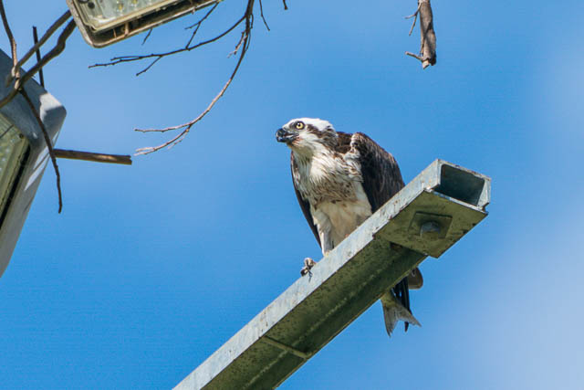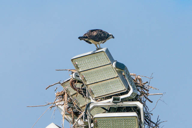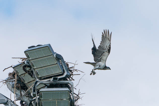It flew to the top of the nest. We could not see what was going on, but later looking carefully at the photos, it seems that the Osprey swapped nest sitting duties with its mate (which was out of sight). The mate flew off with the rest of he fish and settled on the lower part of the light.