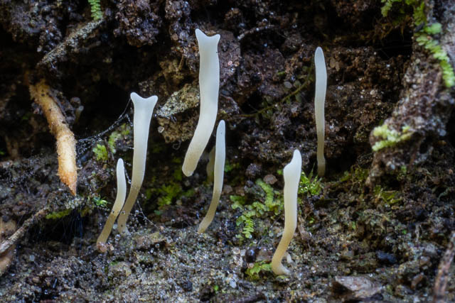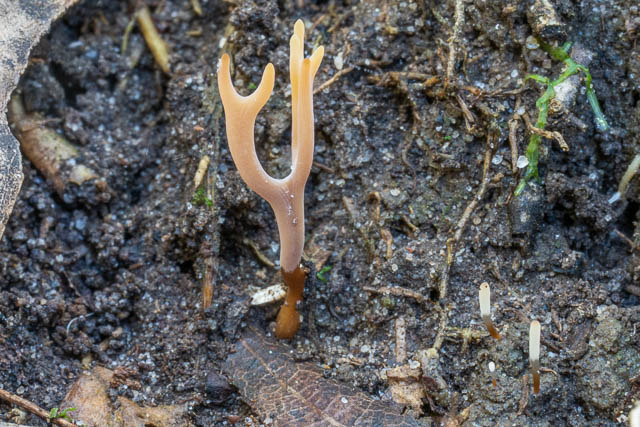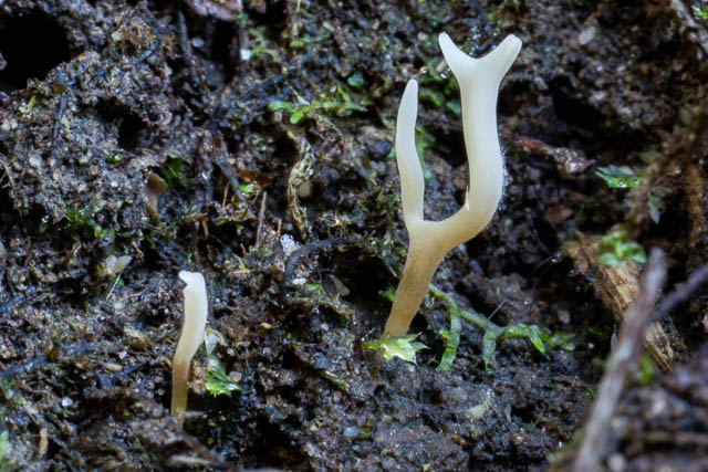 In the same spot are two species of very tiny coral fungi. I can’t recall seeing these at other locations, and I have been unable to find them in guidebooks or online. They both appear to be member s of the genus Ramariopsis – given their small size and the way they branch.