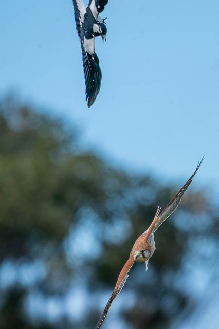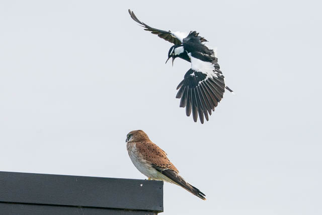 Nearby was a Nankeen Kestrel. But all was not well. It was being harassed by some Magpies. It flew away from them and perched on top of a building. But the magpies followed and drove it away.
