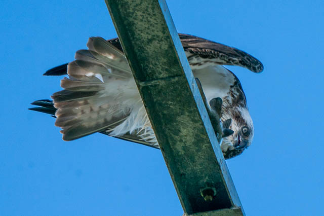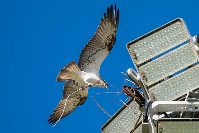 I was concerned that their nest may bot have survived the recent very windy weather. Their nest is on top of a light post at the field. Their nest seemed to have survived, but perhaps their eggs didn’t or did not hatch. The Ospreys were mating!