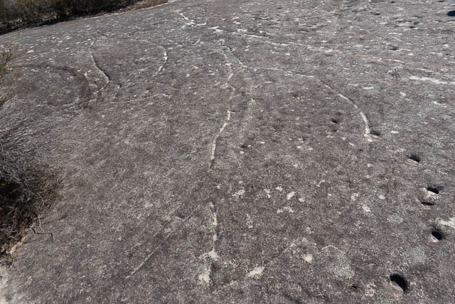In one place a set of Emu footprints have been carved into the rock. Many of these engravings are very faint and we needed to look very carefully to see and interpret them.
