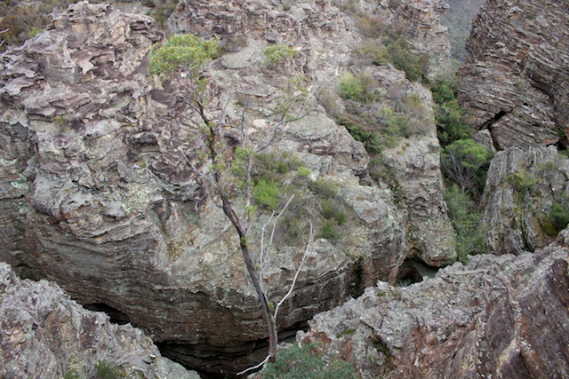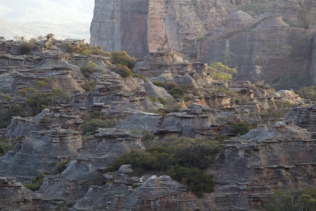 What I also carried was some photographic gear. The place is a paradise for photo-pfaffing. The massive clifflines are interesting and so are the valleys – the Wolgan and the Capertee – both are often visible at the same time. Also – the tops are rent in various places by chasms, slots and rifts. There are pagoda rock formations in many places and in a few places are dome shaped formations.