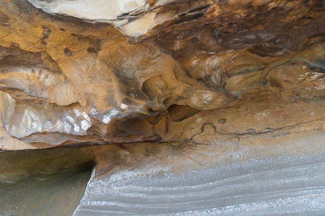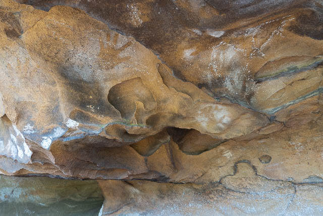 On the way out back to the main road, we diverted to visit an interesting Aboriginal Art site. This was a cave with a lot of hand stencils, drawn pictures and engraved pictures – of animals and humans.