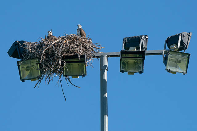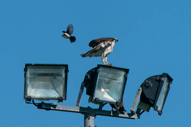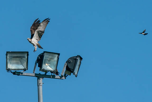 Nest, it flew off again and perched on a distant lamp. It was then joined by the second Osprey. But a Willie Wagtail, who must have a nest nearby, took objection to there presence and bravely encouraged the Ospreys to relocate somewhere else.