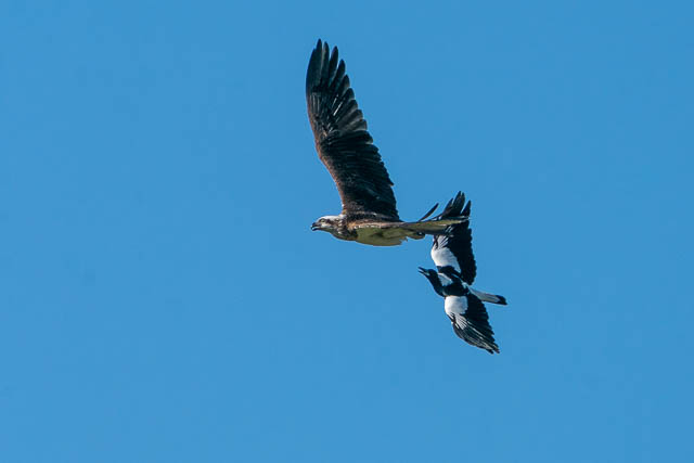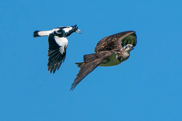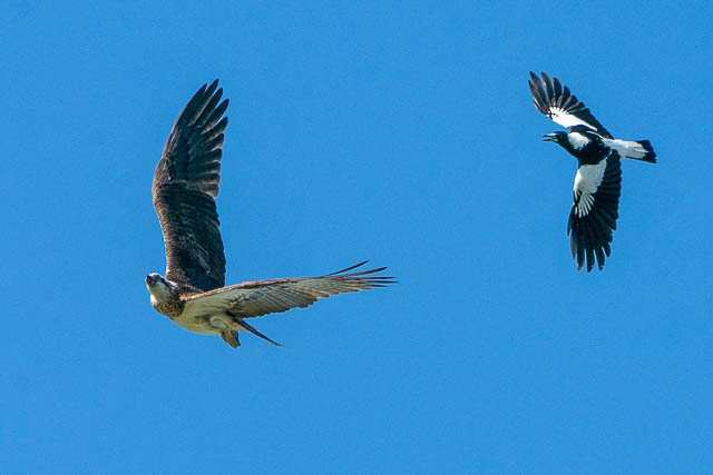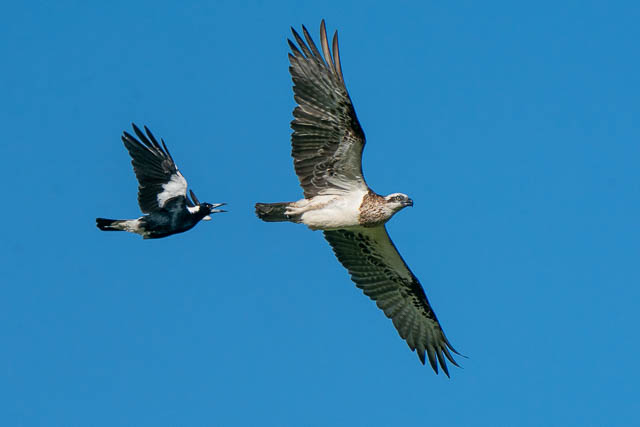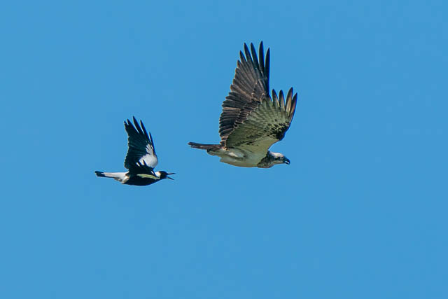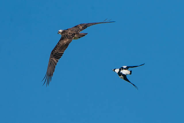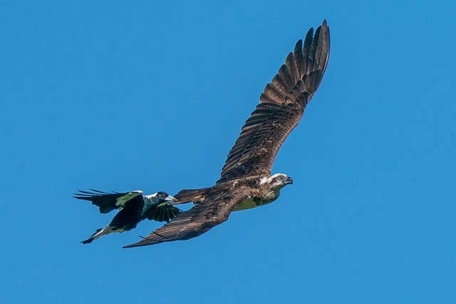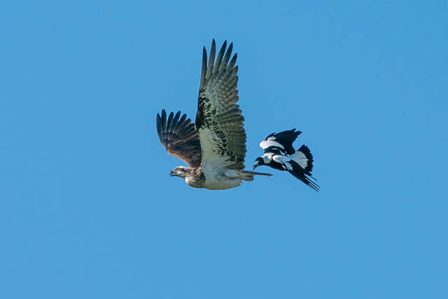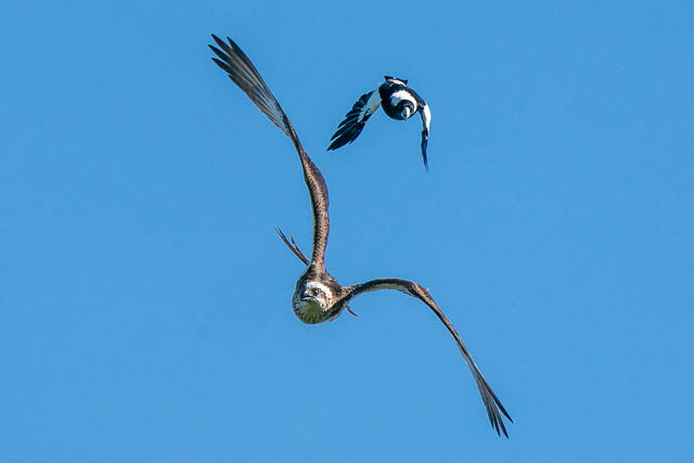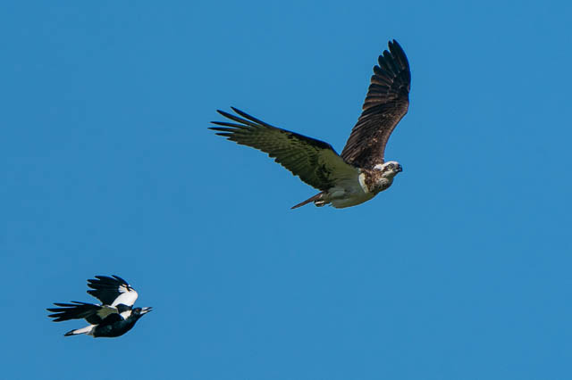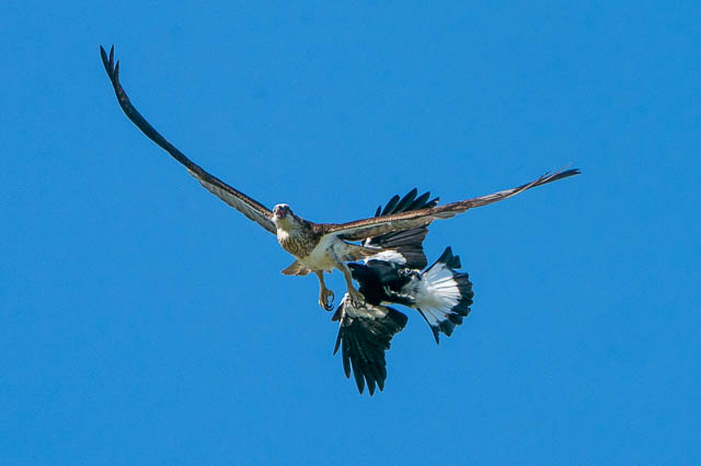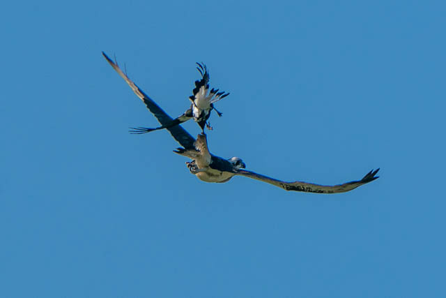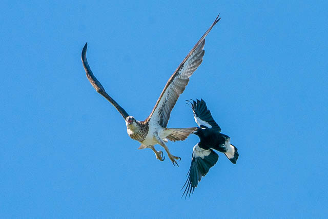 There was also another bird photographer there. The Ospreys were early active. One took off for a flight. But it was immediately harassed by a Magpie. This was an amazing spectacle to watch. I took many photos as the Osprey flew around trying to shake off the Magpie. Here are some of the photos.