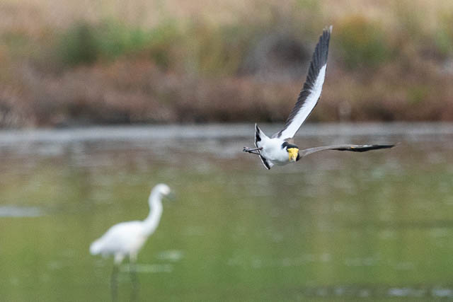 I then headed back down to the Wetland. The Egret was being harassed by a Masked Lapwing. It was flying to get away and had to do some very evasive manoeuvres.