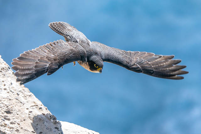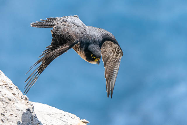 It then flew off with the bird. It probably flew into the nest to deliver the bird to young or its mate. I later spotted it on a sunny ledge. I again waited to see if it would take off.
