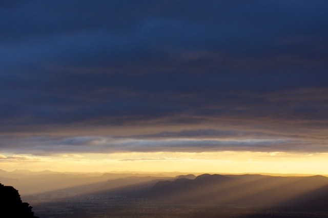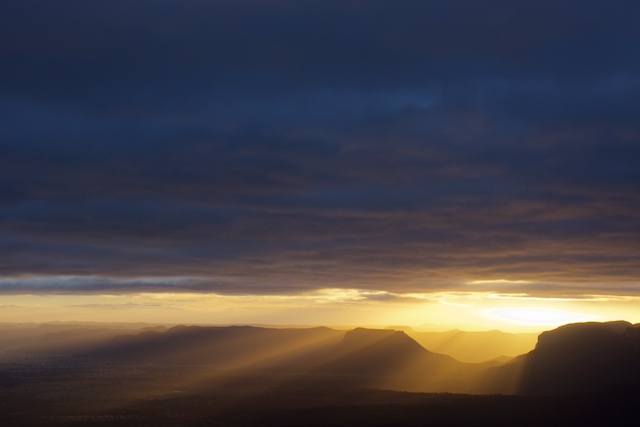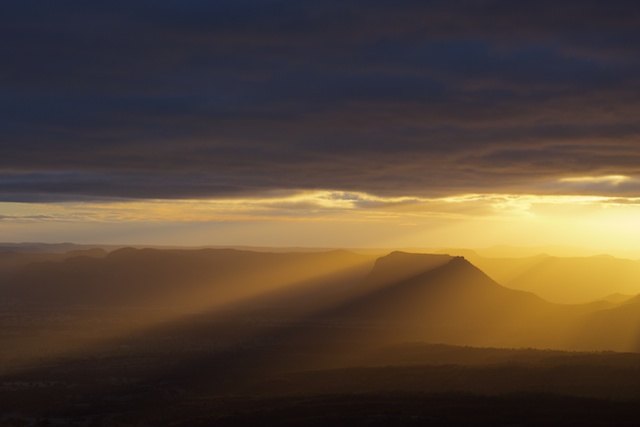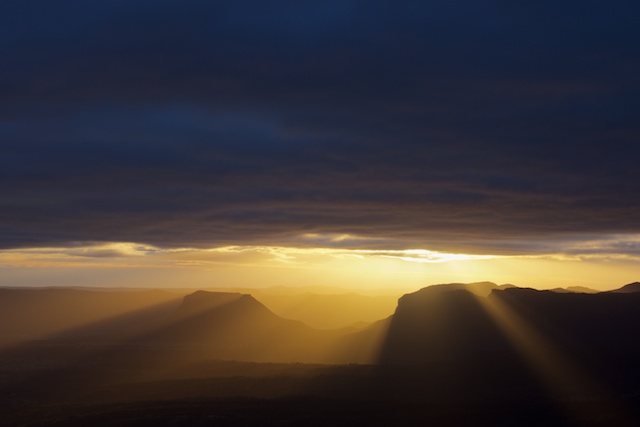 The actual sunrise was pretty ordinary – not surprising give the cloud cover. But a few rays of sunlight did emerge in the east. I was about to pack up my photographic gear when a good light show started. It was another golden hour – with golden rays of the sun merged from the clouds and penetrated to the bottom of the Capertee Valley.