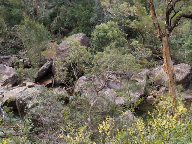 There is a track all the way down the Grose River (on the true right side) – called the Engineers Track – but it is now quite overgrown and hard to follow in places. It was built a long time ago for part of a railway survey. I’m not sure how long it would take you to walk down the river – anything from 2 to 4 or 5 days depending on your speed and the river conditions.