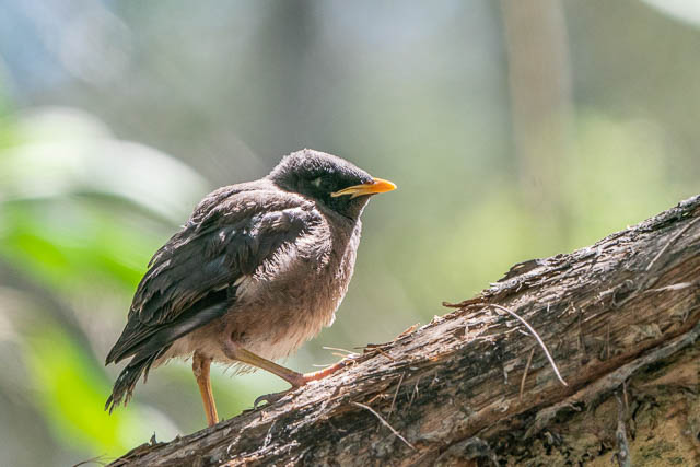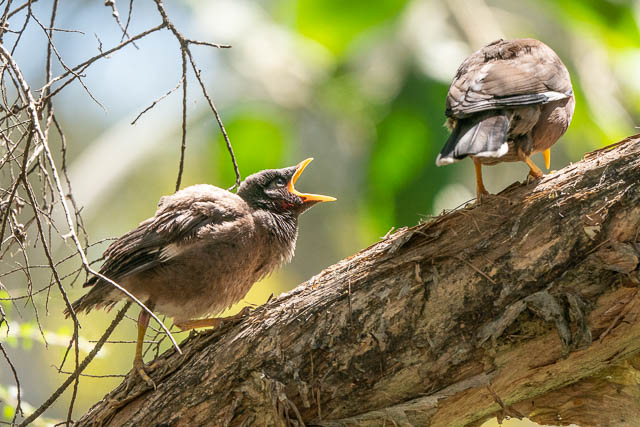 Another young bird was being fed. A fledgling Common Myna. It was very demanding for food. One parent fed it, and then it kept calling for more. The second parent then fed it.
