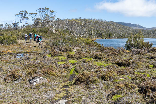 A bit further on we left our rough track which continues on to the Vale of Hinam. We crossed some open moors of the Zion Vale and headed towards Lake Thor. We made our way around the eastern shore, again on a faint pad, to reach an open area. Here we looked around for campsites. It was quite windy at the lake, so we looked a little further back in a more sheltered area. We found some reasonable sites – but they were a bit spread out. Shane and Alicson made an exploratory trip beyond our campsite to check out the route up to the Daisy Lakes for the next day.