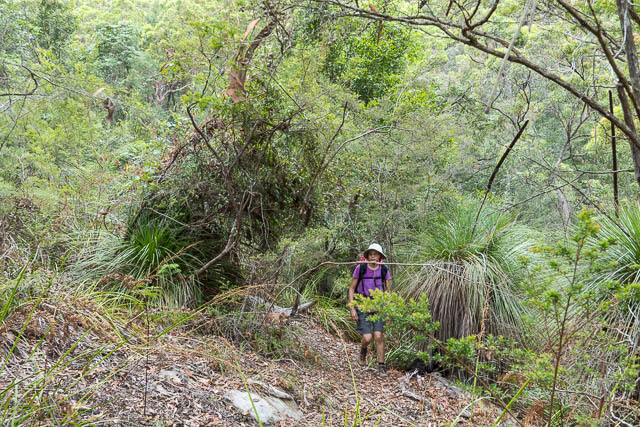 Easy walking – but it was a hot and steamy day. Just before this road dropped down to a creek, we turned off and followed a taped route along a very eroded fire road down to Tanks Creek Campsite.
