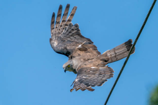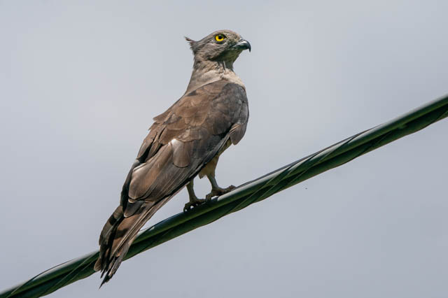 I then walked back to the start of the Wetlands and had lunch at one of the picnic tables near the kids playground. While I had lunch, I could hear a Kookaburra calling nearby. I made sure no food was close at hand that it could grab. As I finished my lunch, a cyclist passed, and then stopped. He asked – “what bird is that” and pointed up to an overhead cable. I said “a Kookaburra”, but when I looked, I saw that the Kookaburra had moved on, and the bird perched there was a raptor – a Pacific Baza.