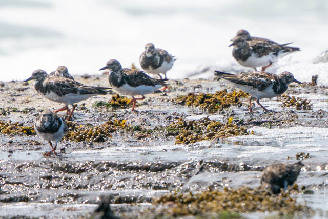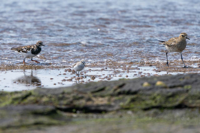 Above – shows a Ruddy Turnstone, a Red-necked Stint and a Pacific Golden Plover.