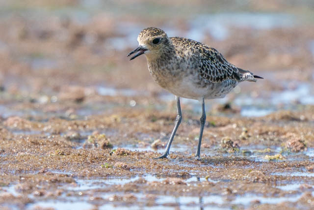 The above photo shows a Pacific Golden Plover and three Red-necked Stints.