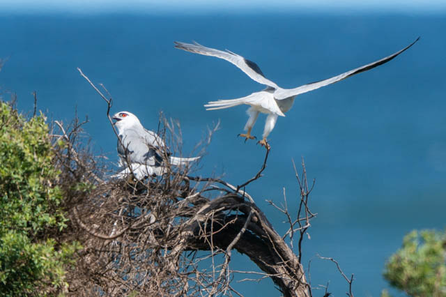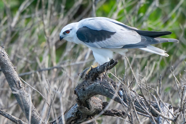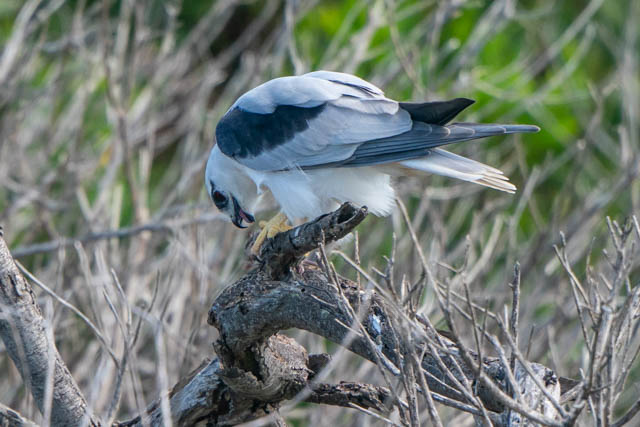 Then I spotted a Black-shouldered Kite. I watched it as it flew over to where another Black-shouldered Kite was perched. It then flew closer and settled on a small dead bush. It had caught a mouse, and then started to eat it.