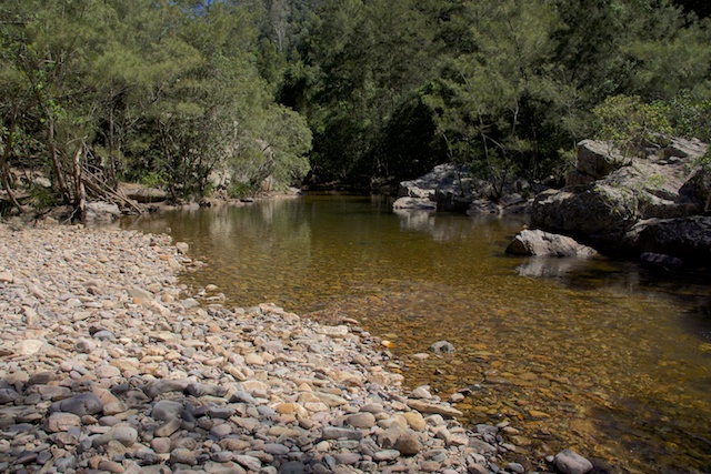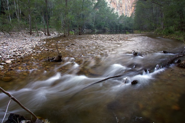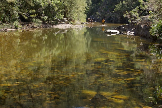 In the mid afternoon, we arrived at our next campsite at Orange Bluff. This is surely one of the most attractive campsites on the Kowmung. A beautiful grassy flat, crystal clear swimming holes in the river. The orange blaze on the quartzite cliffs of the bluff. The gentle rapids of the Kowmung River. Perfect!