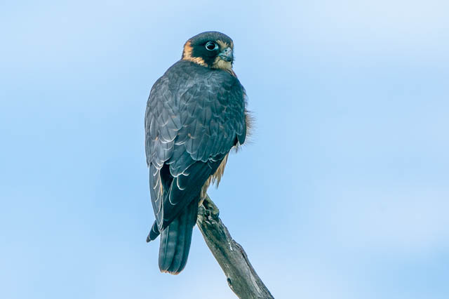 As I walked in, I spotted an Australian Hobby perched on a dead tree. The tree was very close to the road, so I too a few distant photos, then walked a bit closer and took some more, and repeated this until it flew off.