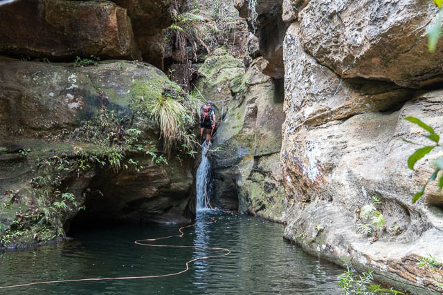 Lower down in the creek, at the start of the canyon we ran into more parties. A large TAFE party learning how to abseil, and a bushwalkers group from the Blue Mts. We didn’t have to wait long, before we could abseil down. And being a small party, we were soon at the front.