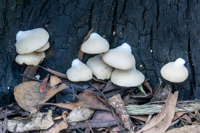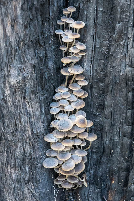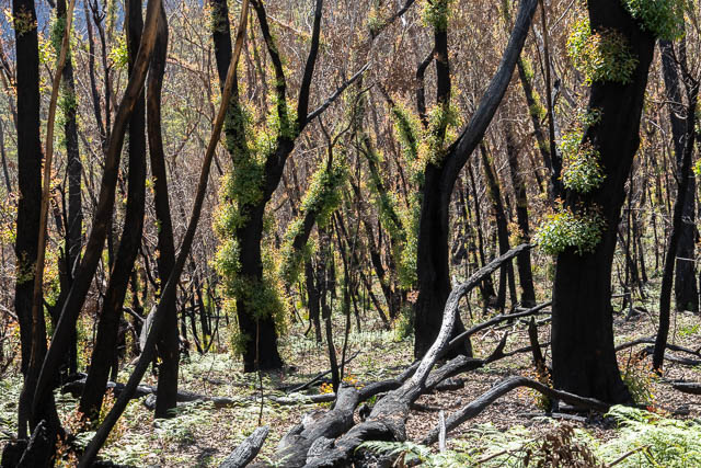 We made fast progress through the Wollangambe, and soon reached one of the exits. We climbed out and stopped for lunch on a rock outcrop near the top of the ridge. Then it was an easy walk back to the Cathedral of Ferns. On the way, we looked at the regrowth after the fires. It was good to see new growth on the top of the tree ferns. Their trunks showed they had been burnt.