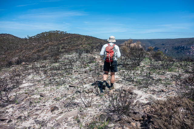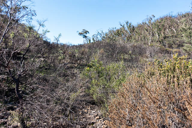 The way in was badly burnt out. The first bit along the fire road was easy to follow. But the last bit – along a rough track was a lot more difficult. The track was quite hard to follow in places. We lost it a few times and then had to look around for it. Why do you need a track when there is virtually no scrub because of the fire? Well – its a lot safer to walk along the track formation. Walking off it is dangerous. Bushes get burnt and often there is a sharp stub remaining. If you tread on one of these, there is a chance of getting impaled. This is particularly the case if you are wearing light shows like Volleys, which have great grip in the canyon, bu have a light sole – that can easily be penetrated if you walk on a sharp stub of bush.