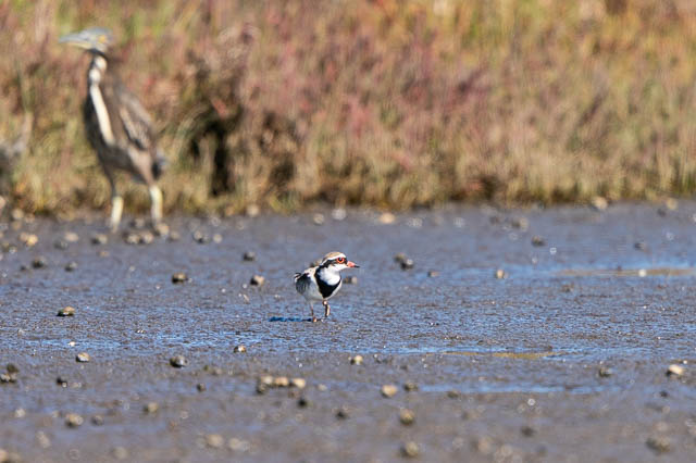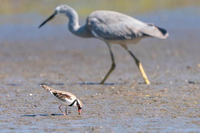 The Striated Heron returned to its spot. Here the White-faced Heron tried to sneak past.
