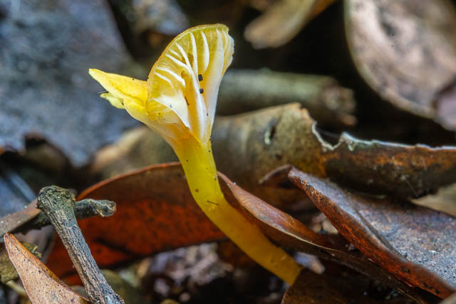 At first sight, there was not too much fungi visible, but with a lot of searching, sometimes well off the track, I found reasonable amount. The trip started well. At one spot higher up the side creek, before the Sassafras Gully Road Track meets the Victory Track, I found some waxcaps, a number of Porpolomopsis lewelliniae out.