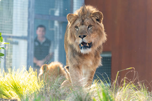 The lions however were asleep and far away. I could just see one of them. I went back an hour or two later – and both lions were out of site. But on my third visit I had luck. I had seen a staff member hide a lump of meat in a tree. The lions were then absent, but hey keepers then allowed them back in, and one of them was active hunting for the meat.