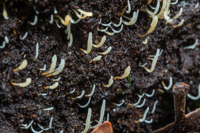 Of the non-waxcaps, these clubs were interesting. I had seen them earlier in the season, and then they went. But a new batch is out, growing in the same place on a log. They we’re about 40 mm tall. Perhaps Typhula sp.