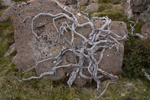 My route took me past Pencil Pine Tarn and then out to the end of the Long Tarns, past Lake Nutting and down to Lake Tyre. All this is very pleasant and easy walking as long as you are patient. You need to be prepare to potter around and looks for the easiest route through small thickest of scrub and stands of pencil pines. The pines often indicate small farms that have to be walked around anyway. Between all this is the most amazing alpine gardens. A maze of scoparia, cushion plants, sphagnum and pencil pines. A very pleasant place to walk through. But too many places where I just had to stop and take photographs. Amazing beauty! Even the dead pencil pines, standing up like skeletons, and a legacy from bush fires dating back to the early 1960’s had their own evocative beauty and power.