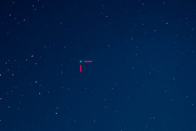 But the camera easily picked it up. I took a few photos. The red lines in the photo above mark the position of the comet. It has the same green colour that it had when I photographed it from Sydney. Here the details are – 85 mm f 1.8, 4 seconds, 1600 ISO.