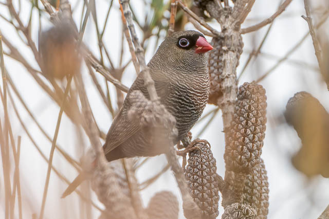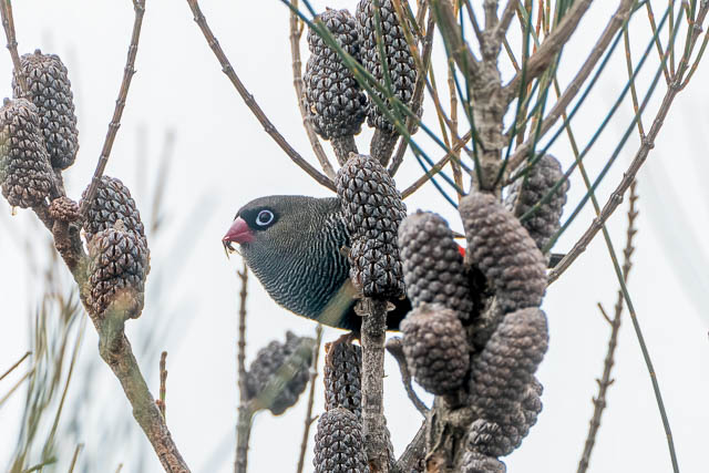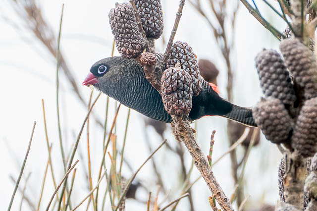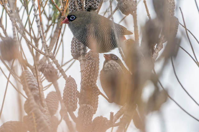 Along the fire trail, we had our best bird experience on the walk. Faye spotted a pair of Diamond Firetails busy eating in a Casuarina. They were concentrating on the food and did not seem too disturbed by us pointing cameras at them.