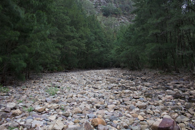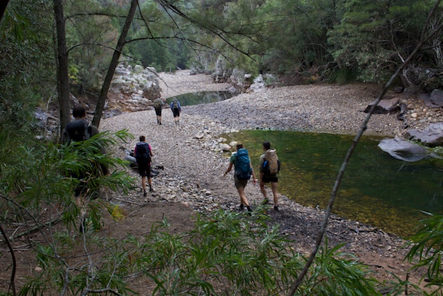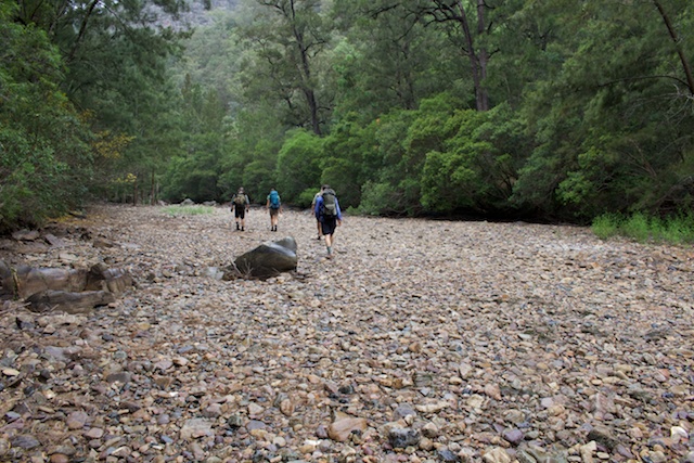We arrived at the Walls and set off about around 11 am for the Bullhead Range and Cambage Spire. For most of the walk to the river we were shrouded in mist. We had a late lunch, on a bump just before Cambage Spire and arrived on the river about 3 pm. The river was very low. Very low indeed! Perhaps as low as I can recall? It was like there bad drought of the early 80’s. In many places the river had ceased to flow – at least on the surface. Perhaps there was some underground flow? There were some reasonable pools and they did look clean.
