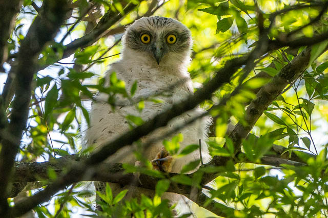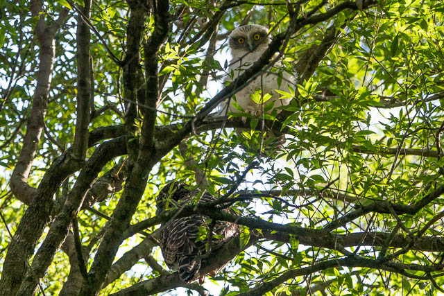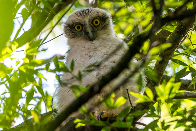 Even though he had seen them the day before hey were difficult to spot. We looked up into the trees along a section of Devlins Creek. After about 20 unites, our persistence paid off. We spotted a parent owl and one of the chicks. Then with a bit more looking, we spotted another parent and chick.